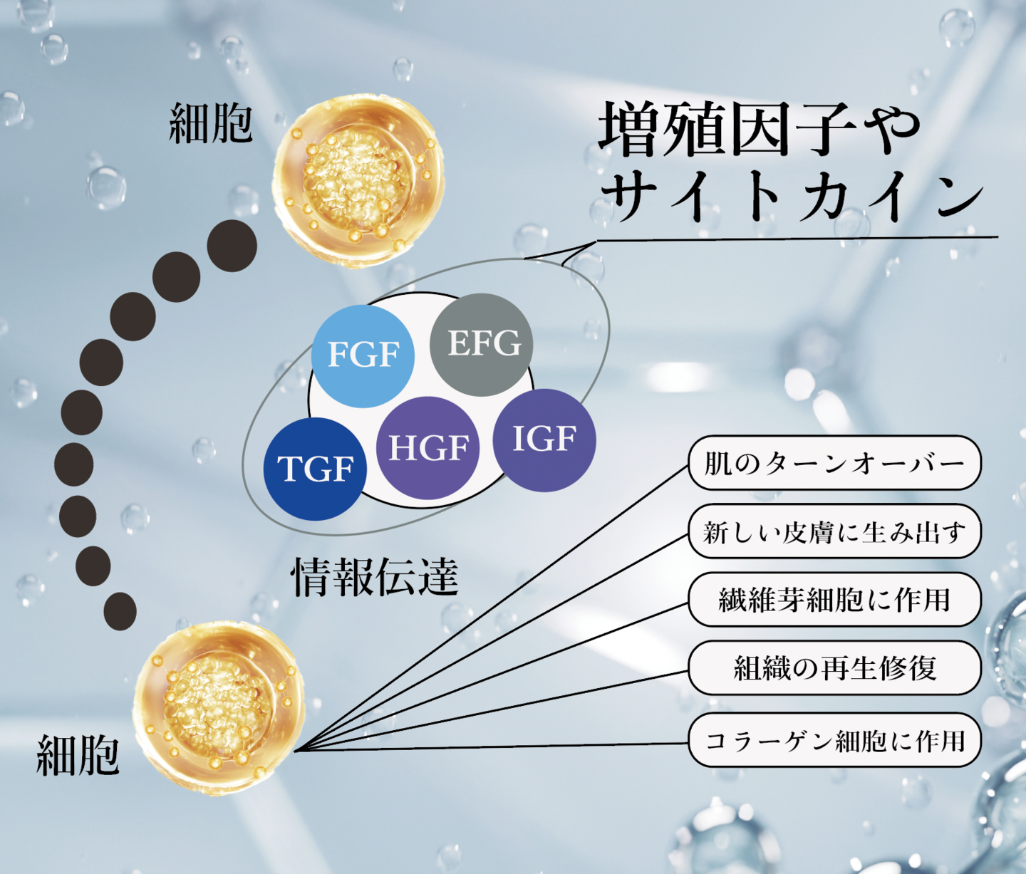 サイトカインは、体内の損傷を受けた組織や細胞の 機能回復に重要な役割を果たし 老化などにより衰えた細胞の回復を後押しするため 美容や健康に対するさまざまな効果が期待されます。